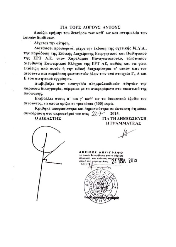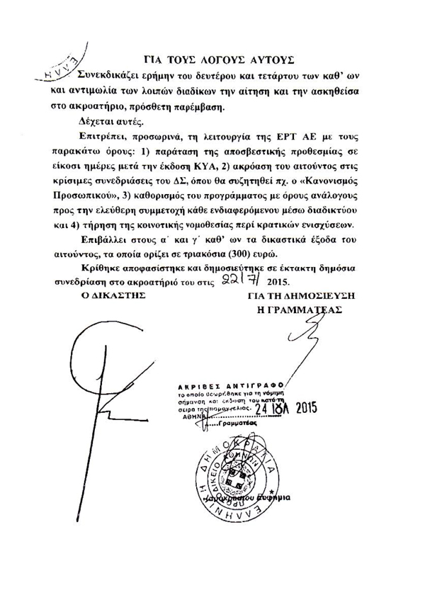 Η απόφαση αφορά στην αίτηση ασφαλιστικών μέτρων που κατετέθη στις 12/02/2015 στο Μονομελές Πρωτοδικείο Αθηνών με αριθμό ΓΑΚ17410-1903-2015, από τον Δικηγόρο Γιώργο Λ. Κόκκα (βλέπε σχετικό άρθρο μας).